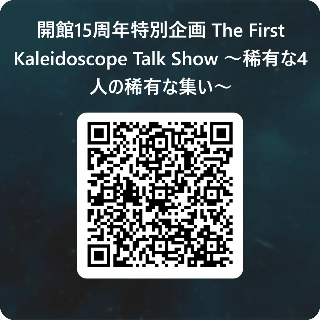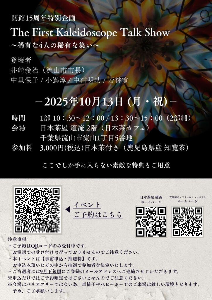 流山万華鏡ギャラリー&ミュージアムの開館15周年を記念して、私、小嶌淳さん、中里保子さん、若林寛さんの万華鏡作家4名でトークイベントを開催します。